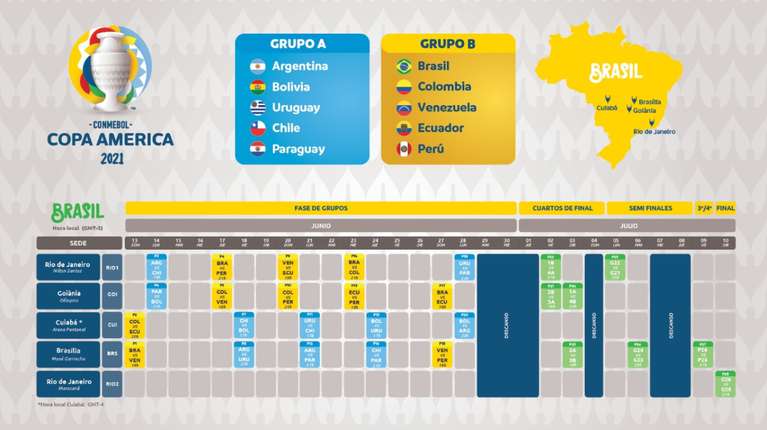 La Confederación Sudamericana de Fútbol compartió el cronograma del torneo continental que se desarrollará entre el 13 de junio y el 10 de julio. Los ajustes en la competencia se dan en el calendario y reglamento, no así en los grupos ni en el formato de disputa.