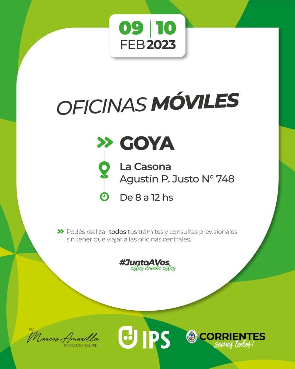 Con el objetivo de realizar los trámites sin la necesidad de trasladarse hasta las oficinas centrales en la Capital Correntina, el jueves 9 y viernes 10 de febrero en el horario de 8 a 12 horas brindará atención y asesoramiento en La Casona del Club Unión Agustín P. Justo 748.IPS junto a vos estés donde estés.