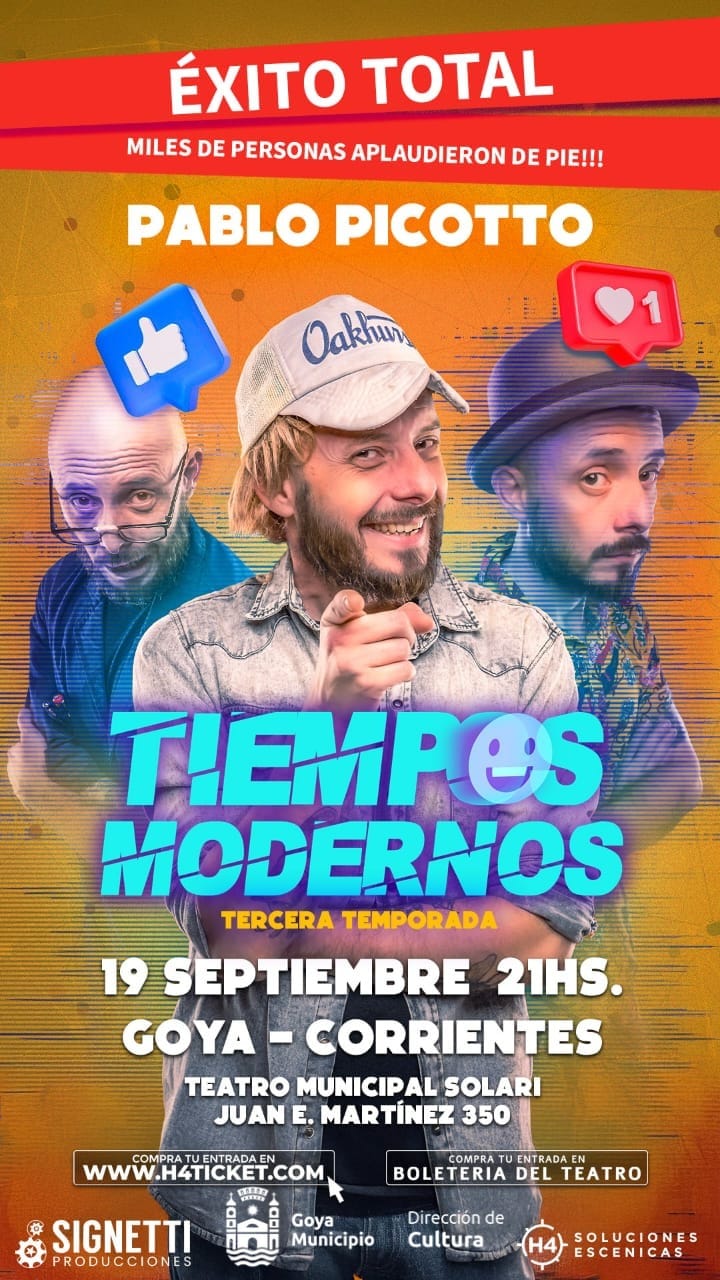 El Viernes 19 de Septiembre a las 21 horas, el Teatro Municipal Solari (Juan E. Martínez 350) se viste de gala para recibir a uno de los humoristas más destacados del país: Pablo Picotto, quien arriba a Goya con la tercera temporada de su exitoso espectáculo “Tiempos Modernos”, un show que ya conquistó a miles de espectadores en diferentes escenarios de la Argentina.