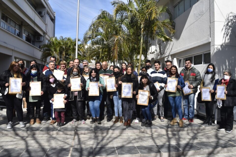 En el acto de entrega de microcréditos, que se desarrolló en el Patio del edificio municipal, estuvieron el Intendente Mariano Hormaechea, acompañado por el Secretario de Desarrollo Humano, Julio Canteros, la Directora de Promoción Social, Mercedes Pinto, y otros funcionarios de su gabinete.