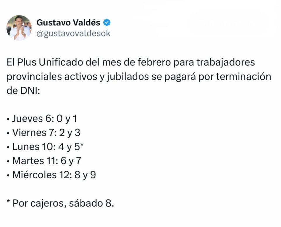 El gobernador Gustavo Valdés, comunicó el cronograma de pago del Plus Unificado (Adicional Remunerativo Mensual) de $55.000 por agente, activos, jubilados y pensionados, correspondiente a Febrero 2025. La liquidación comienza este jueves 6 y se extiende hasta el Miércoles 12.