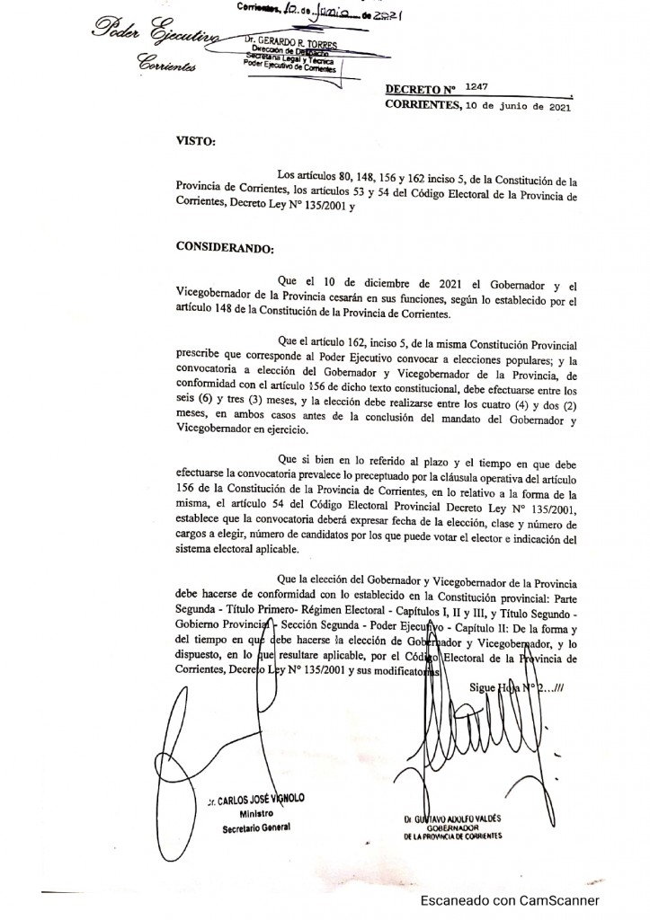 Esta mañana el Gobernador Gustavo Valdés firmó y se emitió el Decreto Provincial N° 1247/21 mediante el cual se convoca a elecciones para Gobernador y Vicegobernador.