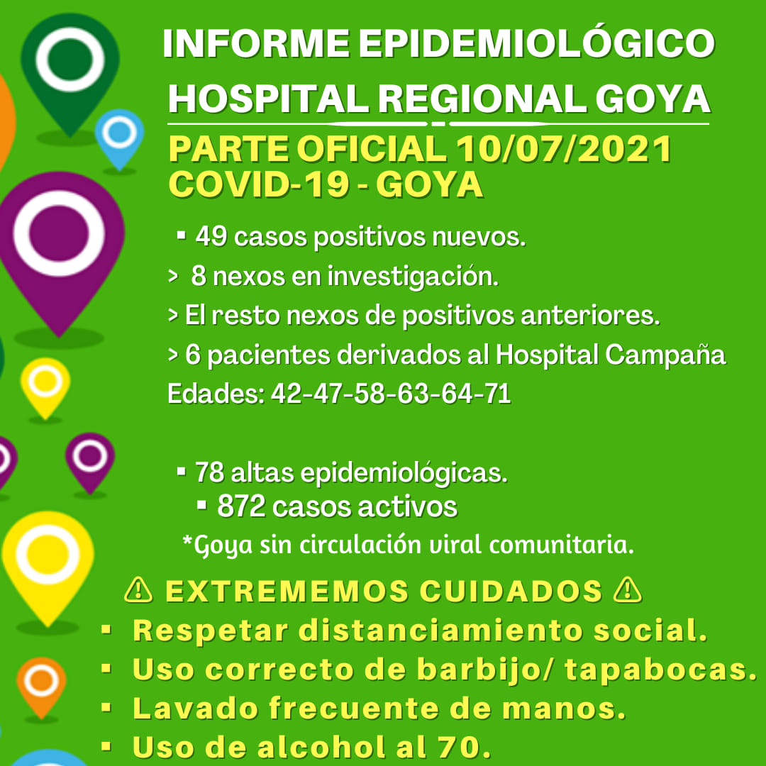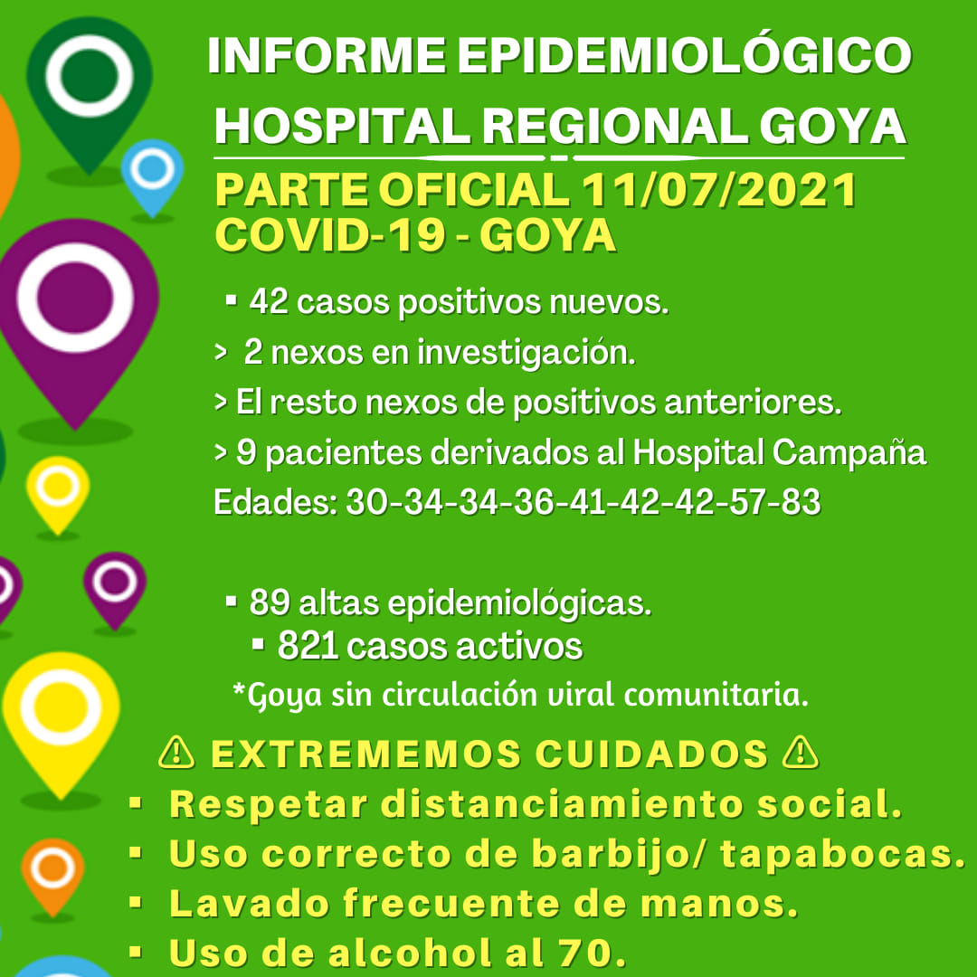 El parte oficial del hospital regional Goya este domingo informó que se registraron 42 casos nuevos de covid en tanto que el día sábado la cifra de nuevos contagios fue de 49. El total de pacientes derivados al Hospital de campaña durante el fin de semana fue de 15 pacientes.