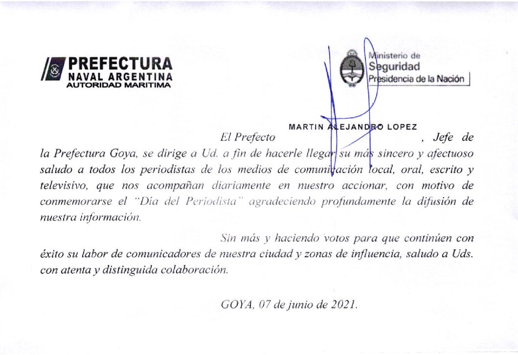 El Prefecto MARTIN ALEJANDRO LOPEZ, Jefe de la Prefectura Goya, se dirige a Ud. a fin de hacerle llegar su más sincero y afectuoso saludo a todos los periodistas de los medios de comunicación local, oral, escrito y televisivo, que nos acompañan diariamente en nuestro accionar, con motivo de conmemorarse el “Día del Periodista” agradeciendo profundamente la difusión de nuestra información.