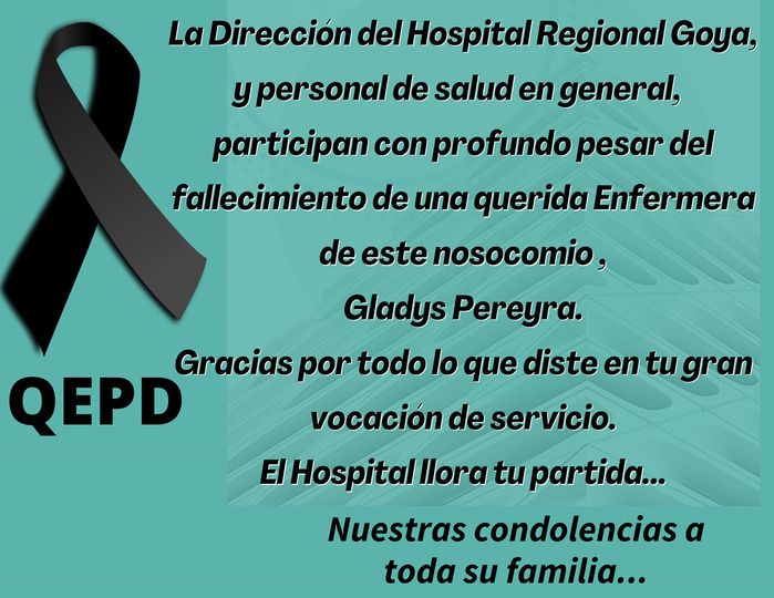 Gladis Pereyra estaba internada en el Hospital de Campaña, tras luchar contra el covid-19. Lamentablemente hoy se conoció la triste noticia de su fallecimiento. Gladis, una reconocida enfermera del Hospital Regional Goya, siempre mostraba su leal vocación hacia su profesión. Q.E.P.D. Gladis.