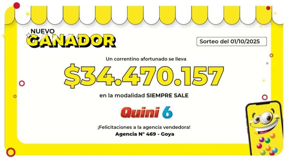 Goya vuelve a estar de festejo tras conocerse que un apostador resultó ganador en la modalidad Siempre Sale del Quini 6, llevándose un premio de $34.470.157. El afortunado acertó los números 20 – 28 – 39 – 42 – 43, convirtiéndose en uno de los grandes ganadores del último sorteo. El ticket fue vendido en la Agencia Oficial Nº 469 de Goya, reafirmando una vez más la confianza y transparencia del juego oficial.