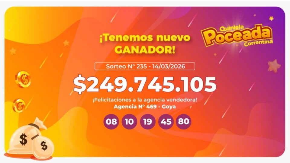 Un apostador de Goya se llevó el pozo millonario de $249.745.105 al ganar el primer premio de la Quiniela Poceada Correntina. Los números de su suerte fueron: 08, 10, 19, 45 y 80, jugados en la Agencia Oficial N°469 y coronados en el sorteo de ayer, sábado 14 de marzo.