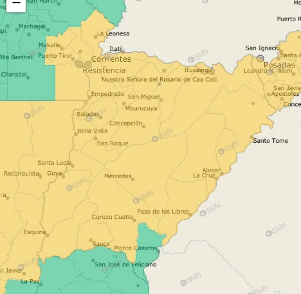 El Servicio Meteorológico Nacional emitió un alerta amarilla por altas temperaturas para este Martes. Para la ciudad de Corrientes está previsto una temperatura máxima de 36°C. La localidad de Monte Caseros es la única área del territorio provincial que queda fuera de esta advertencia meteorológica