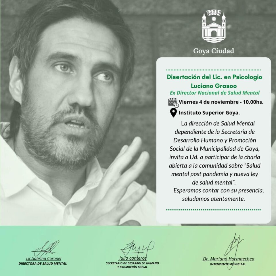 La Municipalidad de Goya invita a la Disertación a cargo del Lic. en Psicología, Luciano Grasso, Ex Director Nacional de Salud Mental, el viernes 4 de noviembre a las 10 horas en el Instituto Superior Goya.