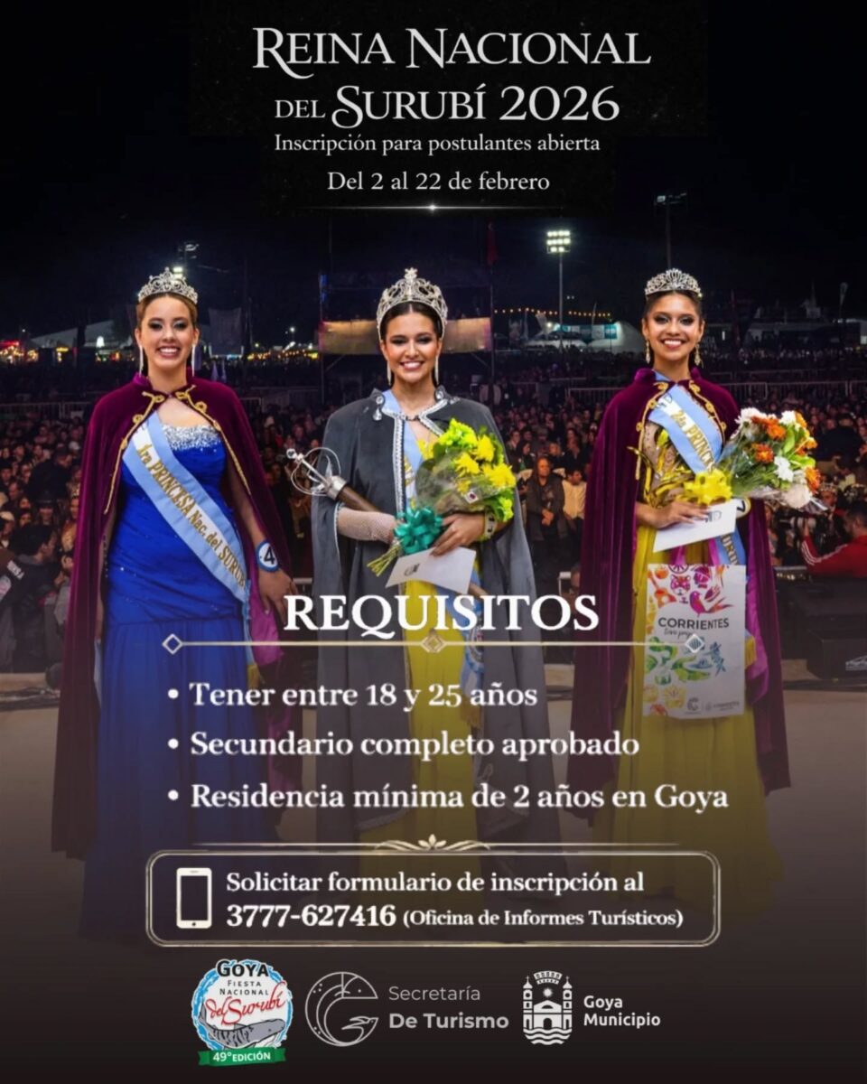 La Secretaría de Turismo informó sobre la apertura de la inscripción para postulantes a Reina Nacional del Surubí 2026: del 2 al 22 de Febrero. Mirá todos los requisitos y pedí el formulario al 3777-627416. Sumate a esta posibilidad de ser la nueva gran embajadora de Goya.