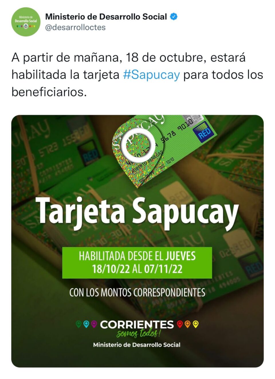 NoticiasSe encuentra habilitada la tarjeta Sapukay 18 octubre, 2022 Se informa a los beneficiarios de este programa que este martes 18 de octubre se habilita la Tarjeta Sapukay, con los montos correspondientes. Asimismo recordar que se puede utilizar la misma hasta el próximo 7 de noviembre.