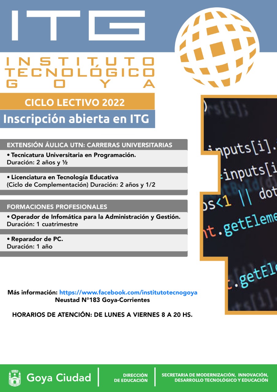 Para más información e inscripciones acercarse al ITG de lunes a viernes de 08 a 20 hs. en Avenida Neustadt 183 o visitar la web https://www.facebook.com/institutotecnologicogoya