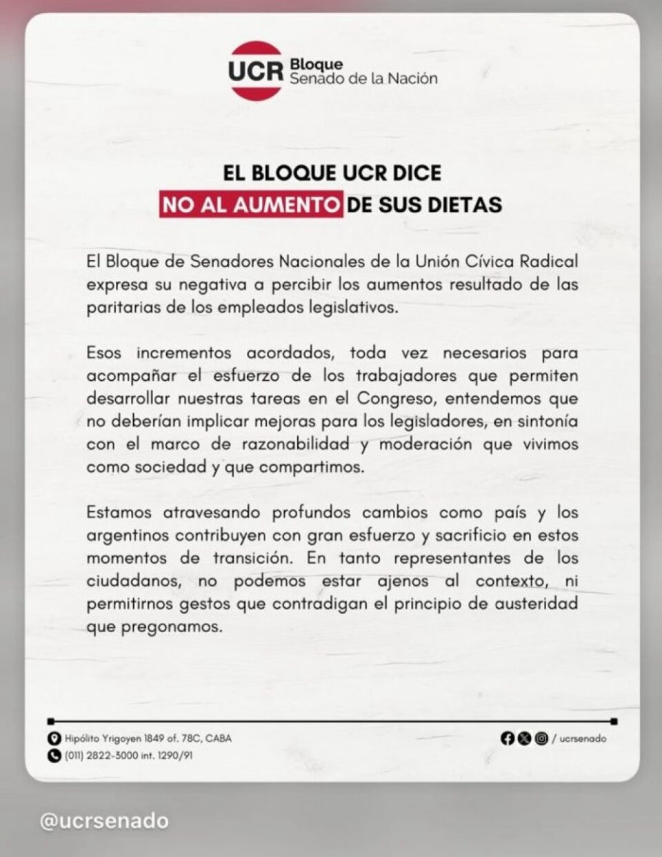La decisión fue anunciada mediante un comunicado difundido por la bancada radical, que es presidida por el senador correntino Eduardo Vischi. En el mensaje, el espacio expresó su negativa a recibir los incrementos salariales que surgen de las negociaciones paritarias del personal del Congreso.