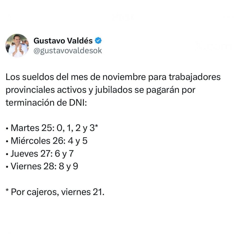 El gobernador Gustavo Valdés dio a conocer el cronograma de liquidación de los haberes. Comienza este Martes 25 y se extiende hasta el Viernes 28. Alcanza a los agentes de la administración pública provincial, activos, jubilados y pensionados.