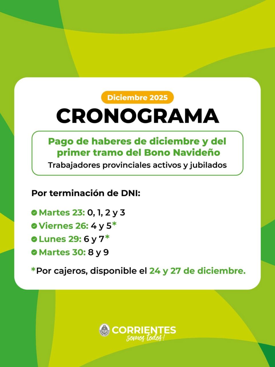 A través de las redes oficiales del Gobierno de Corrientes, dio a conocer el cronograma de pago de haberes del mes Diciembre y el primer tramo del Bono Navideño anunciado, para trabajadores provinciales activos y jubilados.