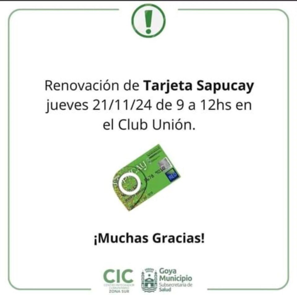 La actividad se desarrollará en el Club Unión a partir de las 8:30 de la mañana hasta las 13 horas y está dirigida exclusivamente a beneficiarios actuales del programa. Este Jueves 21, el Ministerio de Desarrollo Social de la Provincia, en conjunto con la Municipalidad de Goya, llevará a cabo un importante operativo de renovación de tarjetas Sapukay.
