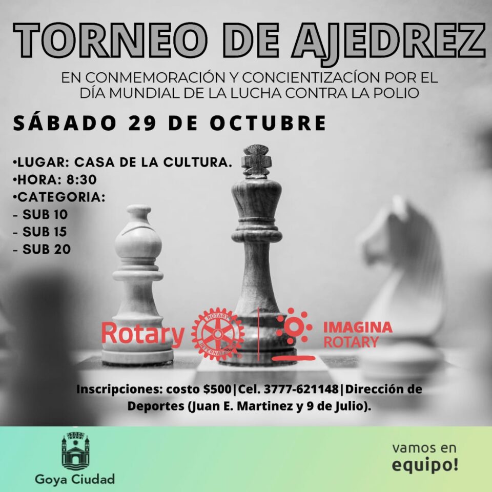 La Municipalidad de Goya, a través de la Dirección de Cultura, comunica que está abierta la inscripción para la disputa del Torneo de Ajedrez “Conmemoración y concientización por el día mundial de la lucha contra la polio”.