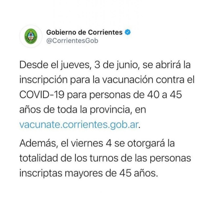 El Gobierno provincial informó por medio de su Twitter oficial, que a partir de este jueves 3 de junio se abrirá la inscripción para la vacunación contra el COVID-19 para personas de 40 a 45 años de toda la provincia en la página vacunate. Corrientes.gob.ar