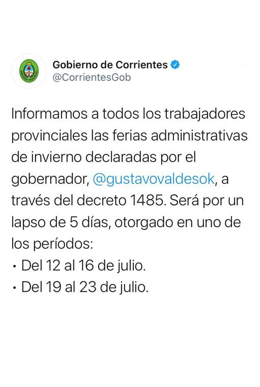 A través del Decreto 1485, el gobernador Gustavo Valdés determinó la feria administrativa de invierno para el personal de las reparticiones de la administración pública provincial central, organismos descentralizados y autárquicos, la que será utilizada por los agentes en uno de los períodos comprendidos, entre el 12 y el 16 de julio de 2021, y el 19 y el 23 de julio de 2021, respectivamente, con excepción de las áreas de Salud, Seguridad, el Instituto de Cardiología y la Dirección Provincial de Energía (DPEC), en las que cada titular de dichas reparticiones tomará las medidas necesarias para que el personal a su cargo utilice esta feria administrativa en el período establecido.