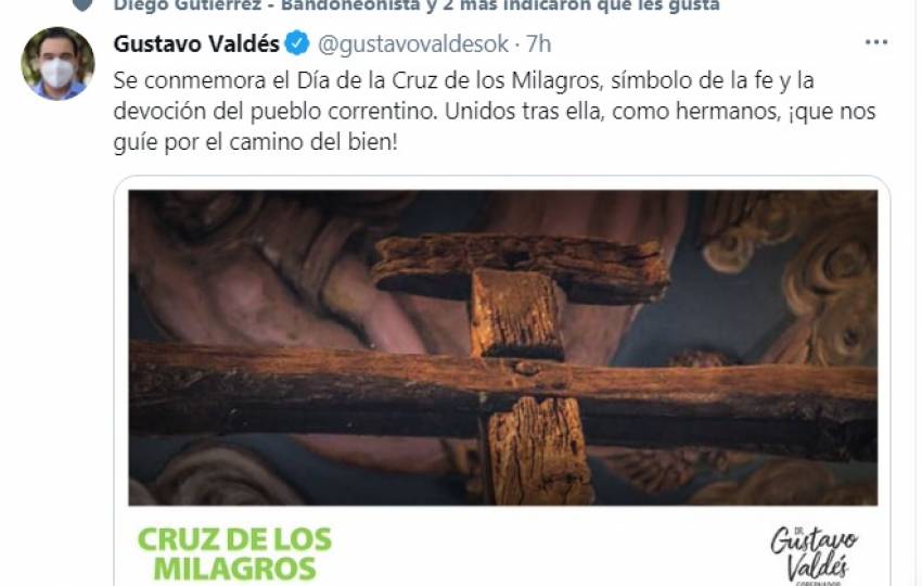 A través de sus redes sociales, el gobernador Gustavo Valdés difundió un mensaje por el Día de la Cruz de los Milagros.