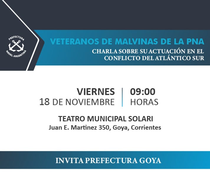 Se invita a la charla que ofrecerán los Veteranos de Malvinas de la Prefectura Naval Argentina, este viernes 18, desde las 9 horas en el Teatro Municipal.