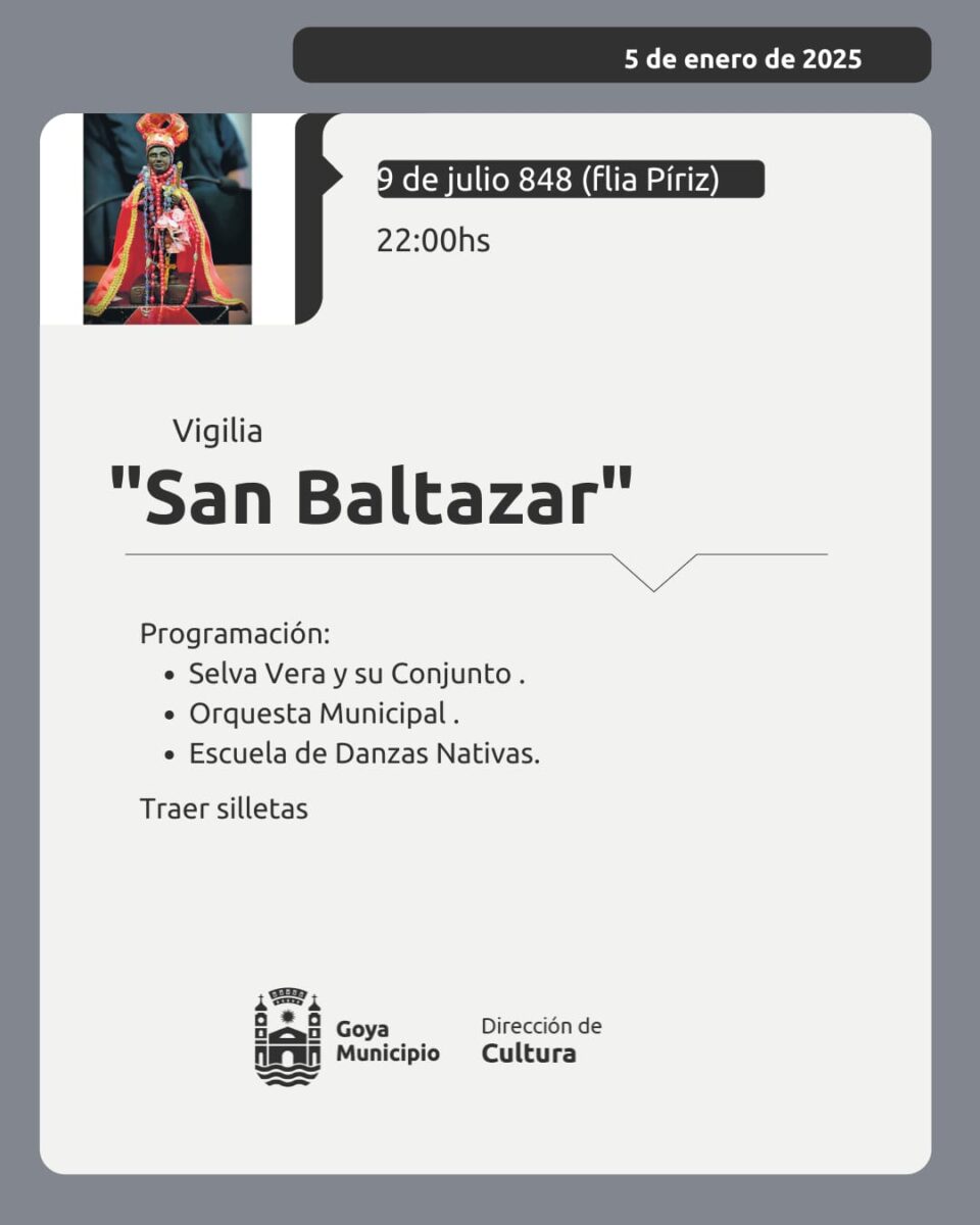 Con la imagen heredada por la Familia Piriz, la Dirección de Cultura invita a esperar el día comúnmente denominado de “Los Reyes Magos” el 6 de enero, al Festival en Honor a San Baltazar, se realizará el 5 de enero desde las 22 horas en el domicilio de la familia antes mencionada, sito en calle 9 de julio 848.